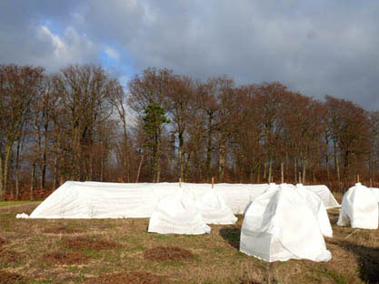 | VLIESIGLUS Themen: Frost Windstress Bodenabdeckung Im Winter 2009/10 habe ich Vliesiglus gebaut. Sie sind auf einem Foto unten bei den Vliestunnels zu sehen. Als Träger habe ich die Stützpfähle der Bäume und gekreuzte 6mm-Federstahlstangen von 5 Meter Länge verwendet. So habe ich elf Bäume einzeln in "Iglus" von etwa 1.50 Meter Höhe und etwa 2.2 Quadratmeter Grundfläche eingepackt. Das Vlies habe ich teilweise mit Klammern an den Federstahlstäben befestigt. Am Boden habe ich das Vlies mit Steinen beschwert, um Windverwehung zu verhindern. Bei Starkwind hielt diese Konstruktion allerdings nicht, sondern musste stets abgebaut und wieder neu aufgebaut werden. Iglus haben gegenüber einfachen Hüllen den Vorteil, dass man sie betreten kann und die Pflanzen mehr Raum zur Verfügung haben. Zudem bedecken sie eine größere Bodenfläche und nutzen so die Bodentermik besser. Allerdings versagen die "geothermischen" Effekte völlig bei länger anhaltendem tiefem Dauerfrost wie im Februar 2012. Der entscheidende Nachteil von Iglus ist die große Angriffsfläche für Wind. In meiner eher exponierten Lage hat es die Iglus gelegentlich heftig gebeutelt, was hohen Arbeitsaufwand erforderlich machte! Bis etwa -4 Grad hatte ich auch bei mehrtägigem (bis zu einer Woche) Dauerfrost keinen Bodenfrost in den Iglus. Der Temperaturgewinn zur Außentemperatur beträgt 3-5 Grad - wenn nicht Starkwind herrscht. Mit Kerzen oder Öllichtern lässt sich diese Konstruktion bei tiefer gehenden Außentemperaturen und wenig Wind gut "beheizen". Es ist zusätzlich sinnvoll, die Pflanzen in der Iglu-Hülle auch noch direkt in Vlies einzupacken, insbesondere im Stammbereich, und den Boden um den Stamm mit Laub etwa 30 Zentimeter hoch abzudecken. Grundsätzlich sind Iglus eine gute Wahl, aber nur in windgeschützten oder zumindest nicht besonders exponierten Lagen sinnvoll einsetzbar. Allerdings benötigt man einen Lagerraum für die Federstahlstäbe. In der Regel ist eine Garage dafür ausreichen, da die Teile wenig Platz benötigen, nur die entsprechende Länge. TIPP: Iglus sind vor allem in windgeschützten Lagen auch für etwas voluminösere Einzelbäume sinnvoll. |